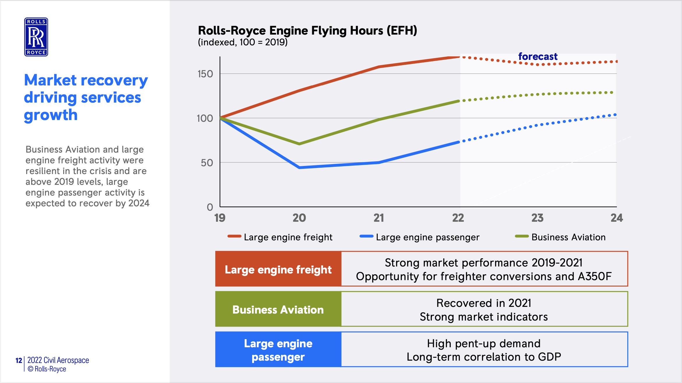 Thankfully for Rolls-Royce, there are plenty of tailwinds as travel demand picks back up. For one, flying hours are forecasted to increase in the medium term. Secondly, freight is anticipated to fly the most hours compared to business aviation and large passenger jets. Therefore, the FTSE 100 firm is expecting more shop visits. Not to forget, the incoming freighter version of the A350, of which Rolls-Royce has a 100% market share, will benefit from this tailwind.