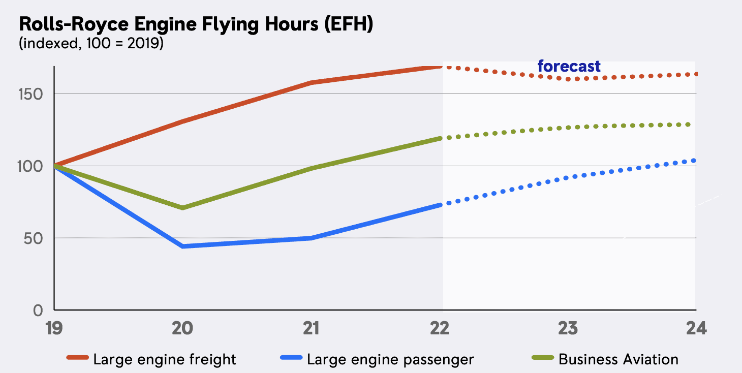 Planes are taking to the skies again. However, in line with other industry forecasts, Rolls-Royce does not see large engine passenger flying hours returning to pre-pandemic levels before 2024. Therefore, Rolls-Royce cannot expect its revenues to bounce back until then, either.